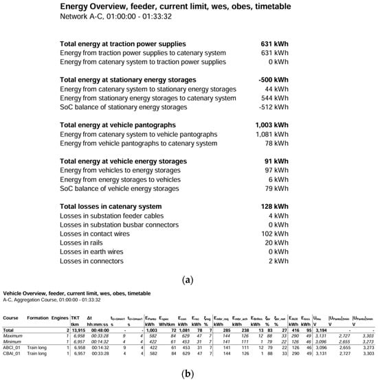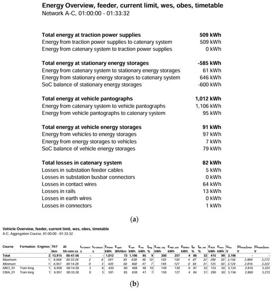 Screenshots of the generated data by the OpenTrack and OpenPowerNet simulation tools with respect to installing the stationary ESS at the location of 7 km, where (a) energy overview of the power traction system; and (b) energy overview of trains.