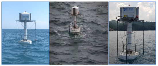 The first tests of the prototype took place on the Danube, followed by tests in controlled environments in Norway and Denmark. Subsequently, the first prototype tested under real conditions was deployed in the Adriatic Sea, Montenegro, in 2017, as shown in Figure 1. This prototype, which was connected to the power grid for a year, proved successful and the environmental impact assessments showed that there was no impact on the marine environment. The prototype, with an installed power of 5 kW, a total mass of approximately 14 tons, and a height of 15 m, underwent extensive real-time monitoring and delivered over 3700 GB of data. The monitoring period facilitated a comprehensive analysis of system efficiency, mechanical and electrical losses, and dynamic forces acting on the structure. The results, recorded at the Sigma Energy Monitoring Centre, revealed the device’s successful operation in realistic sea conditions. The SWEC prototype demonstrated a maximum capture width ratio (CWR) of around 30% proved by the Europe Marine Energy Center, showcasing its potential for future advancements and commercialization efforts.
