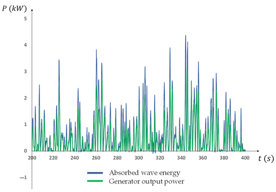 The conducted tests were processed over a period of 1200 s, with real-time signal processing carried out by the developed Sigma Energy program. The data were processed over 1200 s to ensure statistically reliable results as tests must strike a balance between being neither too short nor too long, typically falling within a period of 15 to 30 min. Nonetheless, all gathered data were utilized for both short-term and long-term analyses of efficiency. The result of a typical test is depicted in the following figures. The wave depicted in Figure 2 corresponds to a significant wave height of and an energy period of , resulting in a mean wave power of . In Figure 3, two powers are presented—the power absorbed from the waves and the power at the generator output. The average absorbed power represents the power gained from the waves and signifies the power at the buoy base. This power amounts to 0.6094 kW while the average power at the generator shaft is 0.4899 kW. It can be concluded that the most significant losses occur at the entrance to the transmission system, specifically at the buoy bearing, which will be addressed in future system improvements. Further losses in the transmission system are considerably smaller, as indicated by the relationship between the mentioned powers. During testing, the linear braking torque of the generator was applied, with a constant damping coefficient. Specifically, the ratio of these two powers yields an average CRW of 17.2%.