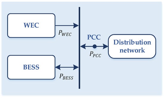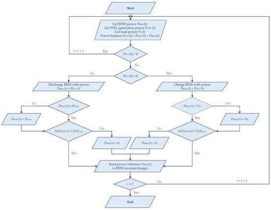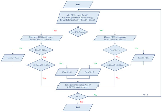 In this case, WEC is coupled with BESS behind the PCC with the distribution network (Figure 5). BESS enables various options for energy management behind the PCC since it can store excess electricity or generate electricity in the case of its deficit. In this case, BESS can be used for techniques of peak shaving and valley filling of the power exchange with the distribution network. To encompass this, a flowchart diagram of a rule-based controller for BESS power dispatching is developed and presented in Figure 6. The main goal of the controller is to maintain power exchange with the distribution network at the PCC to the predefined value . Depending on the relation of WEC generating power and , the controller defines the operating mode of the BESS (charging and discharging), as well as dispatch power . Finally, operational constraints for BESS are imposed in the form of limiting maximum charging () and discharging () power and minimum () and maximum () battery state of charge (). An iterative procedure is executed for every interval in the observed .