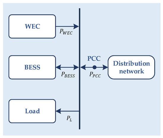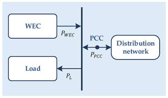 This case represents a simple prosumer, i.e., WEC as a DG coupled with a load behind the PCC with the distribution network (Figure 7). Resulting power exchange with the distribution network is defined by the difference between the current WEC generation and load .