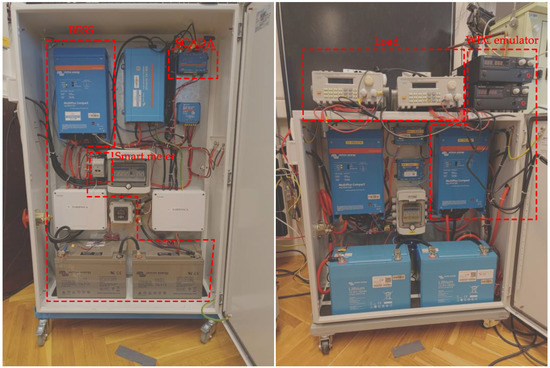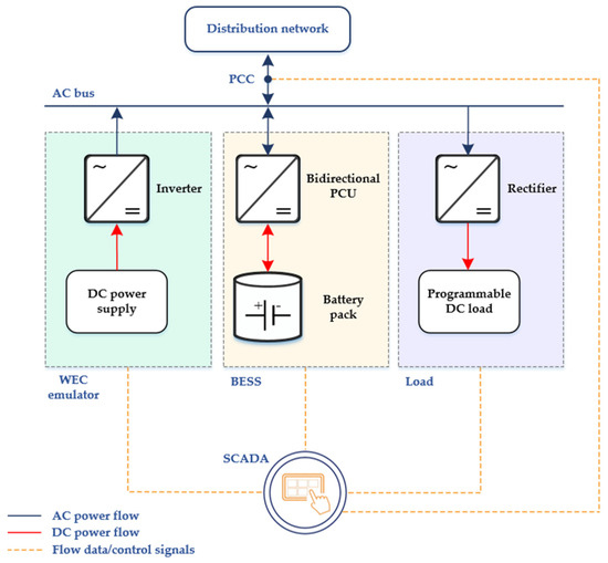 Proposed methodologies for WEC integration are experimentally evaluated using PHIL emulation on a microgrid testbed. The testbed represents a fully monitored and controlled small-scale microgrid equipped with BESS and different emulators of loads and DGs. A block diagram of a microgrid testbed is presented in Figure 10, and Figure 11 shows microgrid testbed equipment with marked elements used in this paper.