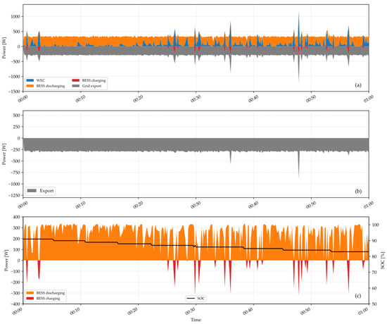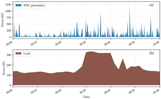 PHIL emulations of each case study are performed for the interval of one hour. Input data for case studies represent WEC generation (a) and load (b) profiles referenced in Figure 12. Specifically, the generated power corresponds to a typical wave profile over one hour at the location under consideration (in the context of statistical wave values). The same applies to the load profile, which is selected to cover various potential scenarios within a single hour.