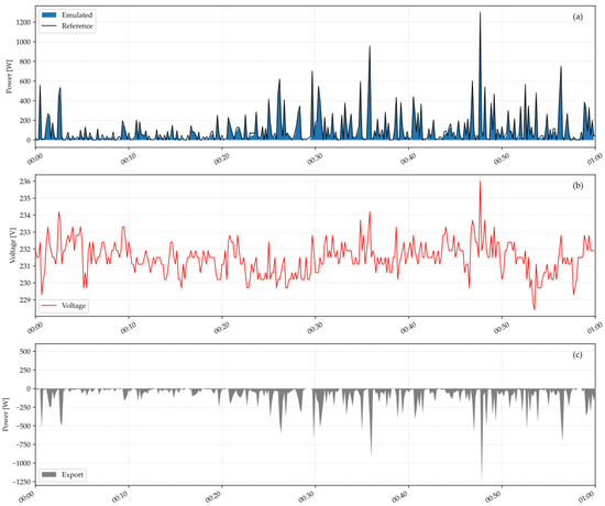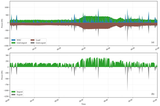 This case study represents a typical prosumer that has no integrated flexibility in operation, meaning that no energy management is available to the operator. Graphical interpretation of the PHIL emulation results is presented in Figure 15 where (a) shows power flows behind the PCC while (b) presents power exchanged with the distribution network. Numerical results are presented in Table 3. The resulting power exchange with the distribution network (Figure 15b) is a result of a difference between the current WEC generation and consumption. As seen in Figure 15a, most of WEC generation is consumed locally while the electricity deficit is supplied by the imported power from the distribution grid. In a few cases when the WEC generation experiences surges and is larger than current consumption, the excess power is exported to the distribution network at the PCC.