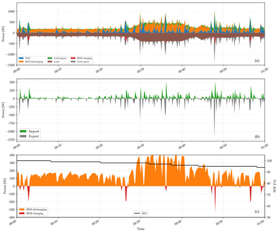 This case study evaluated the developed rule-based microgrid EMS. The main idea of the EMS is to minimize the power exchange between the microgrid and the distribution network. PHIL emulation results are presented graphically in Figure 16 where (a) shows power flows, (b) shows power exchange with the distribution network at the PCC, and (c) presents BESS power dispatching. Results show that the proposed rule-based microgrid EMS successfully minimizes power exchange (compared with the other case studies) with the distribution network at the PCC, but large oscillations of power still occur in both directions (importing and exporting). This is a result of a relatively slow control loop of the BESS PCU unit, which cannot absorb or inject power fast enough. In a case when WEC generating power surge occurs, BESS cannot absorb power fast enough by charging, resulting in power imported from the distribution network. On the other hand, when WEC generating power surge is gone, BESS cannot decrease charging power fast enough, which results in power imported from the distribution network. If numerical results presented in Table 4 are analyzed, the microgrid operates as net-zero energy, meaning that imported electricity (45.65 ) from the distribution network is close to the exported electricity (48.25 ) to the distribution network. Finally, most of the time, BESS is in the discharging mode, trying to minimize power exchange with the distribution network at the PCC, which is also reflected by the decreasing battery’s SOC.