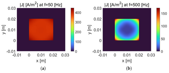 and is shown in Figure 1. In (19), is the total current density distribution and is the source current density or external current density [20]. As shown in Figure 1a, current distributes almost evenly at while it tends to flow with more concentration near the conductor’s surface at due to the skin effect, as in Figure 1b.
