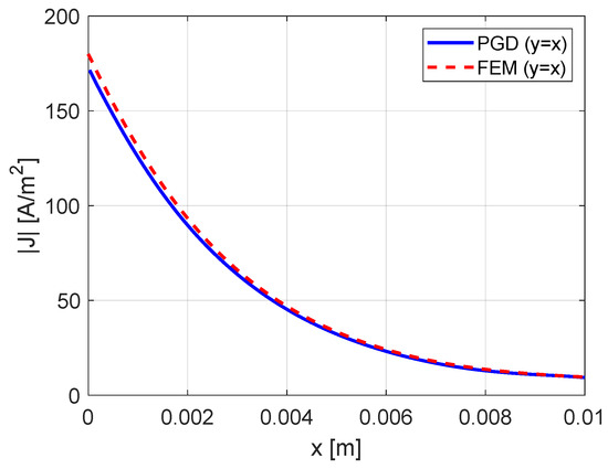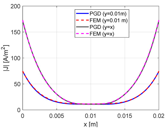 Skin effect is a phenomenon in which ac current distributes with more concentration near the surface of a conductor due to the interaction between the internal magnetic field and the electric current of the conductor. When it comes to rectangular conductors, the edge effect should also be considered [20,59]. PGD is a suitable technique for rectangular conductors since mesh selection is easy and straightforward in Cartesian coordinates. Hence, it covers the edges very well. The magnetic vector potential and, consequently, the current density distribution is calculated by solving the diffusion equation [29]