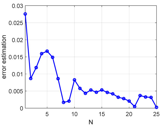 Since the PGD decomposes the 2D system into a series of 1D functions, all these error estimation calculations lead to one-dimensional integrals [42]. This is more computationally efficient than 2D matrix calculation. This paper uses (6) for the internal calculation of each step n. For the stopping criterion, (15) or maximum N should be met to end adding a new term n. If the stopping criteria has not been met, a new term n will be added. This new term is calculated in an iterative way, p iterations, using (7)–(12) until (6) has been met. Then, the stopping criteria (15) will be rechecked. For more details about error estimation, the following papers can be considered [55,56,57,58].