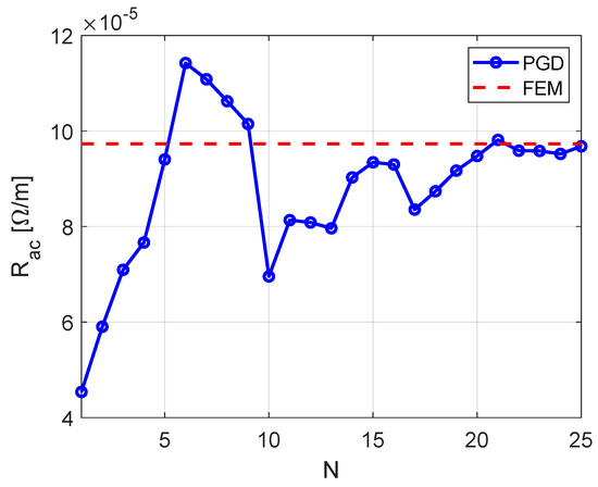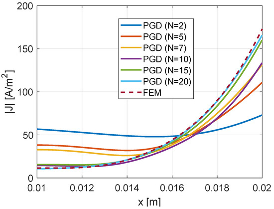 The effect of the number of terms N on the error estimation (15) at is shown in Figure 3. The PUL ac resistance of the conductor versus the number of terms is plotted in Figure 4 at . PGD reached the predetermined threshold of at , i.e., . The PUL ac resistance calculated using PGD is , which matches well with FEM with an error of . (See [29] for details of the resistance calculation.) Selecting a smaller threshold may lead to a more accurate result as more terms are used (see Figure 4). The convergence of the current density distribution as the number of terms N increases in (17) along at Hz is plotted in Figure 5 for the square conductor. As shown in the figure, with the increase in the number of terms N, the current density distribution converges to the FEM solution.