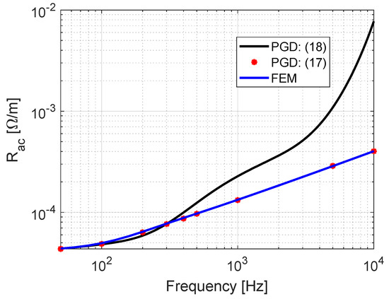 To make a comparison between these two approaches, i.e., using (17) or (18), the single rectangular conductor studied in Section 3.1 is selected. The PUL ac resistance is calculated for both approaches in the frequency range of 50 Hz–10 kHz. The results are compared with FEM and shown in Figure 6. According to the figure, (18) is accurate up to . That is because skin depth is comparable to the conductor dimension at lower frequency range; hence current distributes more evenly, and in turn, it is possible for (18) to have the same X and Y functions for the lower frequency range. However, at higher frequencies such as , the current tends to concentrates more near the surface of the conductor with less current distribution at the middle of the conductor. As a consequence, it is not possible to have the same X and Y functions for low and high frequencies. Therefore, (18) does not work for this broad range of frequency and is not considered for the rest of the paper. Moreover, in other publications employing (18), only a low frequency range, e.g., up to 500 Hz, is considered [44,45]. The calculated using PGD (17) and FEM in the frequency range of 50 Hz–100 kHz is shown in Figure 7. Figure 6 and Figure 7 verify the accuracy of (17).
