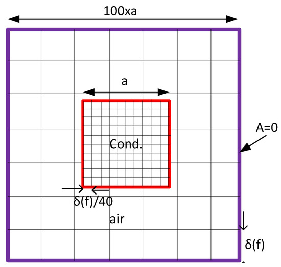 Due to smaller skin depth at higher frequencies, the mesh size is reduced as the frequency increases. Inappropriate meshing can lead to inaccuracy or computational inefficiency. To show this, different linearly spaced meshing is selected over the entire domain for both 50 Hz and 500 Hz. A general schematic of the linearly spaced meshing is plotted in Figure 8. Table 1 shows the effect of mesh size on CPU time requirement, , and the percentage error calculated for the square conductor using the PGD (17). The percentage error is calculated using the determined by FEM that are and at 50 and 500 Hz, respectively. According to the table, overestimating the meshing at 50 Hz, i.e., using mesh size instead of , increases the CPU time from 1008 to 9501 seconds with negligible change in accuracy. On the other hand, underestimating the mesh size at 500 Hz, i.e., using a mesh size of instead of , increases the error by . Therefore, choosing an appropriate frequency-dependent meshing would save CPU time while maintaining accuracy.