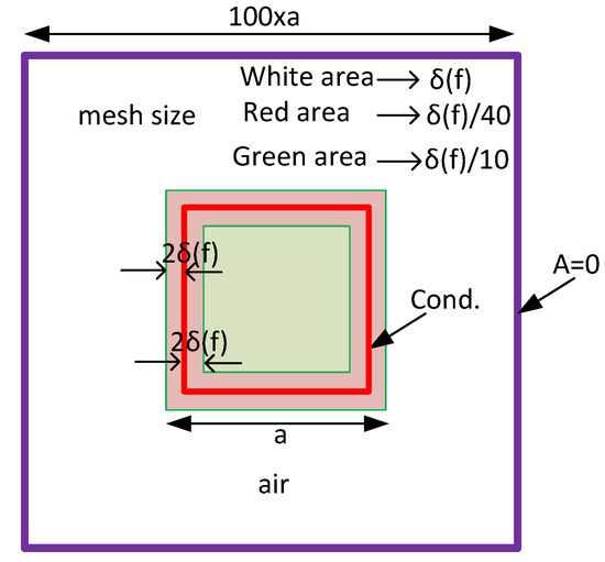 At higher frequencies, most of the current is distributed in a very small layer, known as skin depth, and a negligible current is distributed in the rest of the conductor [20]. Hence, it is computationally more efficient to consider a very fine mesh size for the skin depth, a fine mesh size for the rest of the conductor, and a coarse mesh size for the rest of the domain. To accomplish this, a layer with thickness is considered at each side of the skin depth with mesh size ; see the red area in Figure 10. A fine mesh size for the rest of the conductor (i.e., the green area in Figure 10) and a coarse mesh size for the rest of the domain (i.e., the white area in Figure 10) are selected.
