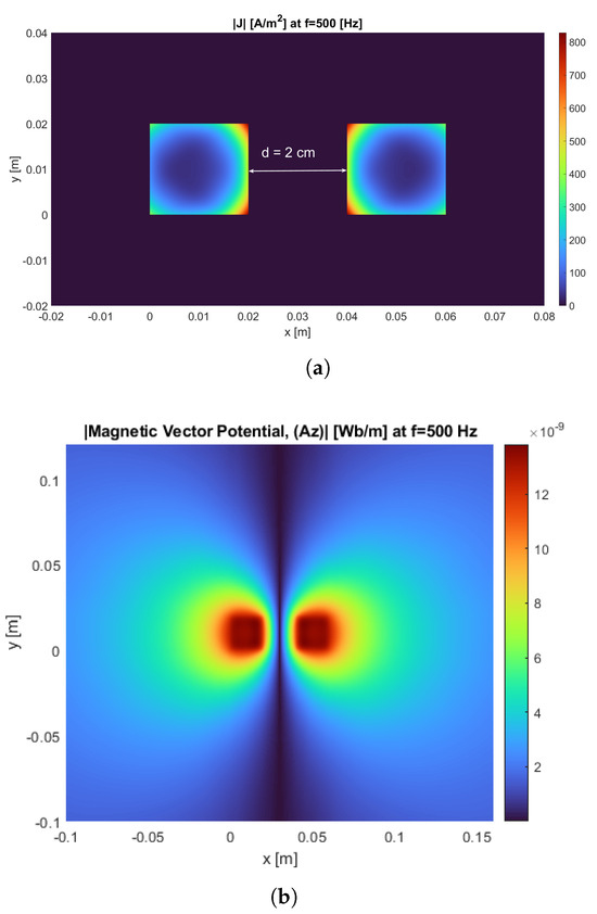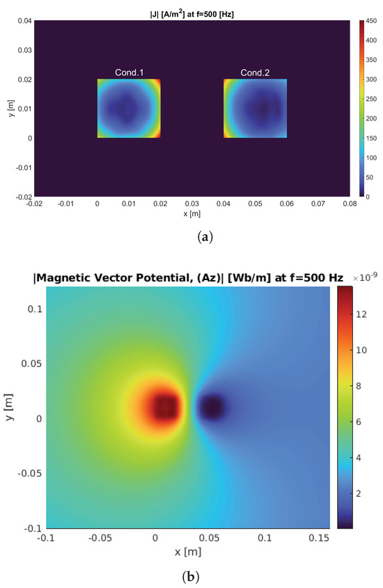Two parallel square conductors with dimensions and material equal to Case 1 and a separation distance of , carrying currents of opposite directions at , are considered in free space. The diffusion equation (16) is solved using PGD, and a final answer in the form of (17) is considered. The magnitude of the current density distribution and magnetic vector potential are shown in Figure 11. According to Figure 11a, the current density distribution of the conductors is affected by both the internal and the external magnetic fields, namely skin and proximity effects, respectively. The ac resistance calculated for one of the conductors using both PGD and FEM is provided in Table 4. According to the table, increases with frequency due to skin and proximity effects. The results of the PGD match well with FEM.