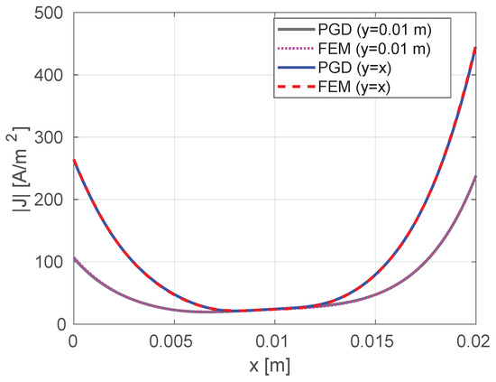 Comparison between FEM and PGD approach (17) for the square conductor of Case 1.