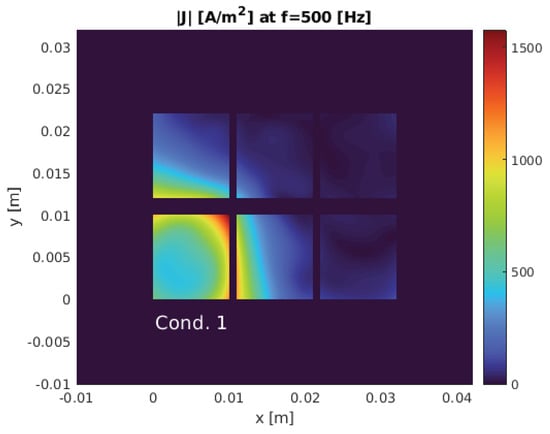 The magnitude of the current density distribution at the cross-section of the conductors determined using PGD is shown in Figure 15. Due to the proximity effect of conductors on each other, the current density distribution is affected. In fact, the current density is the highest at the edges of the array, and the whole array behaves similar to a single conductor.The change in the current density distribution would cause more loss at higher frequencies and, in turn, higher ac resistance. of conductor 1 is calculated as and at 500 Hz using the PGD and the FEM, respectively. The current density distribution in conductor 1 on is calculated using PGD and FEM at 500 Hz and shown in Figure 16.