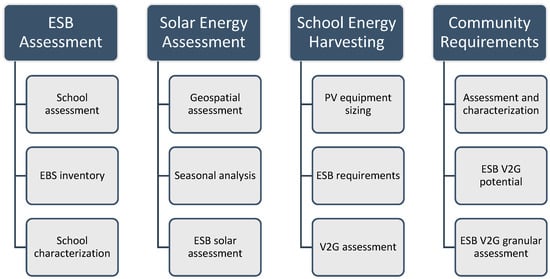 The aim of the proposed framework is to provide stakeholders with the relevant information to optimize the development of solar-powered ESB V2G systems. The project has the potential to furnish significant benefits to both local communities and school districts. The framework integrates a wide array of publicly available big data sources provided by US federal, state and local agencies, National Laboratories and private industries. The data were managed and incorporated into the system by applying algorithms from data analytics, Business Intelligence (BI) and GIS. The data were uniformized into schemes capable of being incorporated into and operating in the systems and algorithms used in the proposed framework. These systems provide outputs consistent with BI, capable of generating actionable knowledge for stakeholders to develop successful ESB V2G systems. Figure 1 presents the diverse tasks required for the implementation of the proposed framework, supplying stakeholders with a reference system to identify the optimal locations to maximize the success potential for the proposed scheme. The first two major initial tasks involve the assessment of the ESB inventory and the solar energy potential across the nation. The last two major activities comprise the comparison of actual solar energy assessments across all schools in the continental US and the potential use of this energy to supply local communities after assessing individual demand patterns.