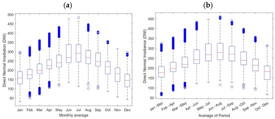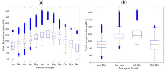 Box plot and whisker chart with average DNI (a) per month and (b) per three-consecutive-month period.