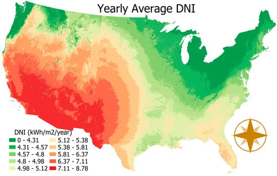 Yearly average Direct Normal Irradiance in the continental US.