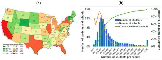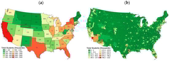 Geographic distribution of students in public schools in the US: (a) state level and (b) county level.