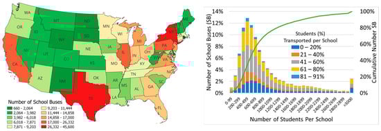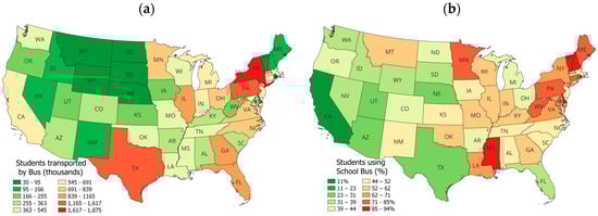 School bus analysis in the United States. (a) Geographic at state level and (b) segmented by enrolled students.