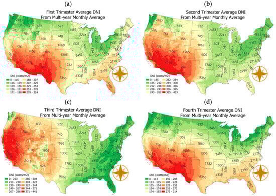 Average DNI per trimester in the continental US, generated by applying Natural Breaks (Jenks). (a) First trimester, (b) second trimester, (c) third trimester, (d) fourth trimester.
