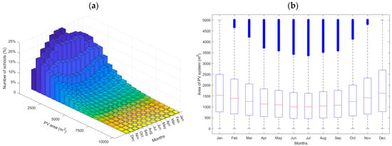 Figure 10 presents results on the required area of PV, considering the lowest DNI month for each individual school. This will satisfy the minimum energy requirement for that particular month and will allow for an energy surplus in the remaining months, creating the potential to charge ESBs several times per year. This will have significant implications for the ESB V2G projects, particularly during the summer months. Figure 10a shows that for most schools, the month that would require the largest PV panels would be December, with only 10% requiring 500 m2 or smaller panels, 52% of schools requiring less than 2000 m2 in area and 90% requiring panels smaller than 5000 m2. In contrast, for June and July, PV panels smaller than 500 m2 would be required for 24% of schools, and 2000 m2 area or smaller will be adequate for 81% of schools, while 5000 m2 would supply 98% of the schools. This is supplemented by Figure 10b, confirming that December is the month with the highest area requirement for most schools to be able to fully supply ESBs, with a first quartile of 779 m2, a median of 1627 m2 and a third quartile of 2692 m2. On the other hand, June and July are confirmed as the months with the lowest area requirement, with a median of 999 m2, a first quartile of 458 m2 and a third quartile of 1640 m2. This clearly indicates that as school PV systems are sized for the months with the least harvesting, the summer months with higher production will generate a significant energy surplus that schools can provide to their local communities through the ESB V2G systems.