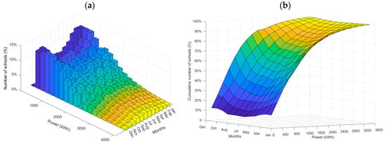 The proportion of schools in the US classified according to their daily power output (kWh) per month: (a) a histogram report per month and (b) the cumulative proportion of schools per month.