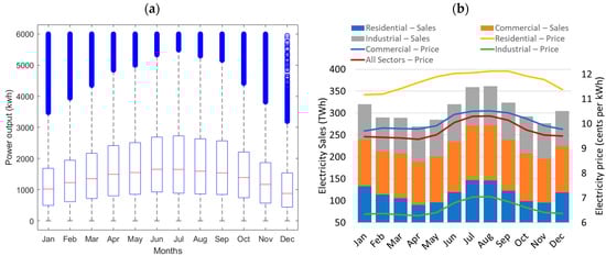 (a) The daily power output (kWh) from schools harvesting solar energy with larger required PV sizing in a box plot analysis. (b) The average retail sales and retail prices of electricity from January 2001 to January 2024 data from the EIA.