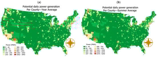 Figure 13 shows the potential average daily power generation and storage that could be provided from V2G by applying the cumulative inventory of ESBs per county and the solar energy generation for each location. The results indicate that the counties with the highest potential for this system align well with the largest urban areas. This is coherent with the proportional sizes of schools depending on the location’s population. However, some locations that have a lower number of students using this service or have lower solar potential present lower energy availability. Figure 13a aids stakeholders in identifying locations that may provide the best potential outlook for the successful development of the proposed V2G system. For instance, one of the counties with high potential for the project is Cook County, Illinois, which is ranked fourth nationally in terms of the number of students, behind Los Angeles, California; Maricopa (Phoenix), Arizona; and Harris (Houston), Texas. These three locations have higher solar potential than Cook County, as shown in Figure 13a. The deciding factor in ranking Cook County in a higher position corresponds to the proportion of students using school buses, which, for Illinois, is more than 50%, which significantly surpasses the less than 20% for California and Texas and the less than 30% for Arizona. The summer months, as shown in Figure 13b, are of critical importance for this project, providing higher solar energy generation potential and full availability for ESB storage, considering their idle schedule during summer school vacations. The increase from the yearly average to the summer (June–August) average is significant for many counties. For instance, 46% of all counties in the continental US could experience an increase between 20% and 30% in energy availability from their ESB V2G systems when comparing the yearly average with the summer average. Furthermore, 21% of the counties could experience an increase in their systems of 30–50% between the yearly and summer averages. The analysis should be performed at a granular level in a case-by-case scenario, considering the significant variability generated by the factors relevant to this system. For instance, when the summer months are considered, Cook and Harris Counties continue to be among those generating higher energy in the nation, with the first one experiencing a summer variability of 33% and Harris just 13%. However, due to summer variability, King County (Seattle, WA, USA) climbs from the number 9 ranking based on yearly averages to the number 3 ranking based on summer averages, surpassing Los Angeles (California) and Maricopa (Arizona) due to its 62% variability during the summer months. This is an example of the benefits that the proposed framework can provide to stakeholders. It can effectively aid them in the selection of the best locations for the development of the proposed ESB V2G systems, considering diverse periods and locations, maximizing benefits for local communities and schools.