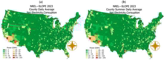 Daily average electricity consumption for continental US at county level. (a) Daily average in 2023. (b) Daily average in June–August 2023.
