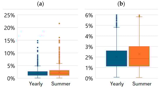 The solar energy harvested and stored by the ESBs, as proposed in this framework, could be applied in a V2G system to supply the electricity requirements of the counties where each school is located. Figure 15 indicates the proportion of each county’s daily electricity consumption that the ESB V2G scheme could provide. The results indicate a median of 1.71%, a third quartile of 2.6% and a maximum of 4.83%, excluding outliers, for the yearly daily average electricity consumption per county. For the summer months (June to August), the contribution is even larger, with a median of 1.85%, third quartile of 3.01% and maximum, excluding outliers, of 5.78%. Electricity demand is highly variable during the day, requiring supplemental generation for the highest-consumption hours, which is generally provided by fuels that have a larger carbon footprint, such as coal. These are the time periods where the ESB V2G system would provide the most benefit by supplying this additional required electricity and replacing more deleterious fuels. Furthermore, there are a significant number of schools that are able to provide a much higher proportion of electricity consumption for each county, reaching almost 15% for the yearly average analysis and more than 21% during the summer months. The highest proportional results during the summer months are very significant, considering that, across the nation, summer is the period with the highest electricity demand and hourly variability.