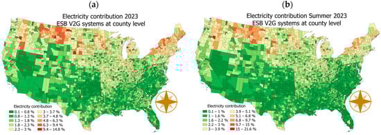 Performing a geospatial analysis of the distribution per county of the ESB V2G contribution to electricity consumption is very important for stakeholders, allowing them to make decisions on the optimal locations to implement the proposed system. Figure 16 shows the electricity contribution per county for both (a) the yearly daily average and (b) the summer-month average for 2023. These results are relevant because they highlight the locations where benefits to local communities would be optimized by supplying the required electricity at peak times. As previously indicated, factors impacting solar energy availability from the system relate to the local solar radiation availability and the number of ESBs. Some rural locations with excellent solar potential, a high percentage of students using school buses and medium to low energy consumption have some of the highest proportional coverage. However, some large urban areas with significant solar potential and large school systems provide good proportional coverage for the system. For instance, in the state of New York, several counties with high electricity consumption would be able to provide a proportion ranging from 4 to 6% based on both yearly and summer month averages. This analysis confirms the potential to provide local communities with sustainable electricity while generating significant financial benefits for their local school districts.