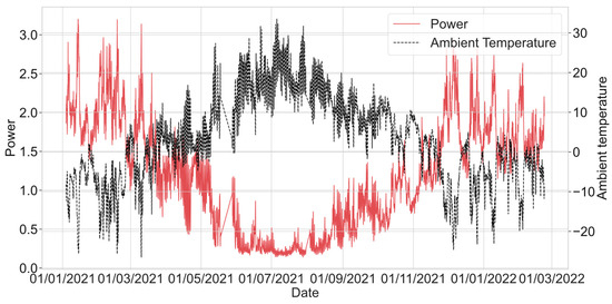 In this paper, the data have been collected from a district heating network in Eastern Finland. We obtain the energy consumption of a district heating system and the ambient temperature. The original time series of the data ranges from 4 January 2021 to 22 February 2022. The values have been recorded every minute. The dataset has no missing values, but it has some intervals where the power and temperature have not been measured correctly. For instance, in some intervals, the power values are constantly increasing or decreasing for no obvious reason. These intervals with incorrect values have been removed from the dataset. After the preprocessing, we had observations for 415 days in total. The power and the temperature were averaged every hour. The preprocessed dataset is presented in Figure 1 below. The x-axis denotes the time in the dd/mm/yy format. The left and right y-axes denote the power in kW and the ambient temperature in Celsius, respectively.