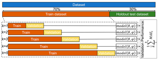 We have used the following scheme for evaluating the performance of ML models. Figure 2 schematically shows how we split the data. In time series analysis, applying the standard cross-validation technique faces significant challenges. Randomly dividing the dataset into training and testing sets is not feasible because it disrupts the sequential order, which is critical in time series forecasting. Essentially, forecasting future data based on past observations is the core of time series analysis, and using future data to predict past events introduces a look-ahead bias, which we aim to avoid. Time series data are inherently sequential, meaning each data point is related to the one before and after it. It is crucial to maintain this chronological order during model validation to ensure the model learns the true patterns in the data. For time series, a technique known as time-based cross-validation is more appropriate. The process begins with a small section of the data for initial training. The model then predicts the next set of data points, and the accuracy of these predictions is evaluated. Importantly, these predicted data points are then incorporated into the training set for the next round of predictions [54]. This approach allows the model to be trained and tested on data in the order it was generated, preserving the temporal sequence and providing a realistic assessment of the model’s predictive performance. In our study, the training and the testing datasets consist of 70% and 30% of the original dataset, respectively. The number of folds in time series cross-validation equals five.