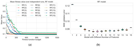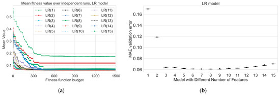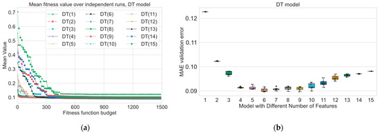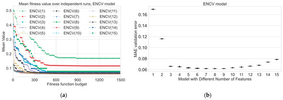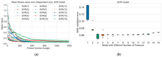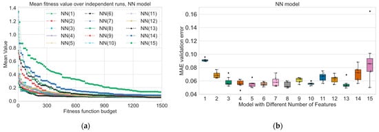 In this paper, we multiply the MAE by the difference in the preferred and actual number of features, as shown in Equation (14), to further penalize solutions that have a different number of variables than the desired number, thereby influencing the behavior of the EA by penalizing excessive or insufficient feature selection. We do not use weights balancing the penalty and the error because of the following factors. The impact of the MAE and penalty is proportional to their values. If the MAE is higher, it will lead to a higher fitness cost. Similarly, if the penalty value is higher (i.e., the difference between actual and preferred features is larger), it will contribute to a higher fitness cost. This proportionality naturally accounts for their influence without needing explicit weighting coefficients. Adding weights can complicate the optimization problem and increase the risk of introducing local optima or convergence issues. Without weights, the optimization process is simpler and may lead to more effective and straightforward search dynamics. However, there may be cases where it is desirable to emphasize one component of the fitness function over the other. In such cases, you could consider using a different functional form for your fitness function or introducing weights if you have a clear understanding of how much importance each component should have in guiding the optimization process. As a starting point, it is often a good idea to keep the fitness function simple and let the evolutionary algorithm handle the balance naturally through its selection mechanisms and scaling techniques. We can define the following purposes of the calculation penalty coefficient in the proposed way:
