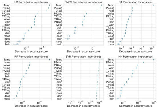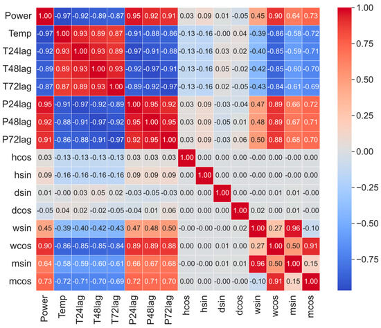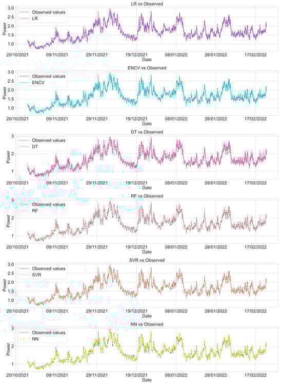The aim of the modeling was to forecast the power consumption of the district heating network in the next 24 h. Based on this scheme, at midnight, optimized models can predict values of power consumption for the next day at an hourly level. As input features, we have been using timing features (hour of day, weekday, week of year, and month) divided into continuous variables by sine and cosine transformations, outdoor temperature (T), and power (P) with time delays. We utilized the actual ambient temperature values in our study as this represents the most optimistic scenario. Consequently, if we rely on precise models that predict ambient temperature, our model will also be accurate. This approach ensures that the assessments and predictions made by our model are based on the most reliable and current environmental data available, enhancing the overall precision and reliability of our findings.