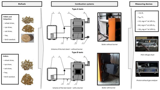 In the first part of the research, the test stand used during the combustion tests of prepared pellets and briquettes consisted of a grate-type boiler with a nominal thermal power of 10 kW and an efficiency of 80%, whose rectangular combustion chamber with dimensions of 0.26 × 0.3 × 0.45 m was surrounded by a water jacket. Air was fed to the boiler at a speed of 1 m·s−1 under the grate using a controlled fan. The boiler was connected to a 3 m high chimney with an internal diameter of 130 mm.