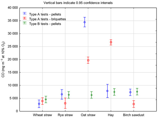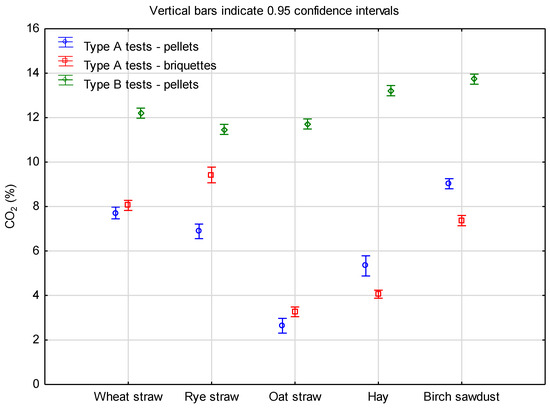 Figure 3 shows the CO2 content in the exhaust gases. During the type A combustion tests, the CO2 content when feeding the boiler, periodically placing fuel on the grate for pellets and briquettes made of wheat straw, rye straw and birch sawdust, ranged from 7–9%. However, under these test conditions, the combustion of pellets and briquettes made of oat straw and hay was characterized by much lower CO2 emissions, approximately 3 and 5%, respectively, which indicated a lower combustion intensity of these fuels under the adopted test conditions. Changing the feeding system to the boiler during the type B tests resulted in an increase in combustion intensity while smoothing its course. The CO2 content in these conditions was within a narrow range from less than 12 to less than 14%—Figure 3.