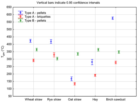 At the same time, the stability of the combustion process during the type B tests was also observed in the range of the exhaust gas temperature (Tgas). In most type A and B tests, the values of this parameter ranged from less than 300 to just over 400 °C. Only for the type A tests, for oats and hay, were the values much lower, at the level of 150–200 °C, and for wood sawdust pellets, the value was much higher—570 °C.
