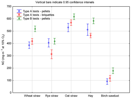 In the case of carbon monoxide emissions during the type B tests, lower emissions were observed than for pellets during the type A tests. It is important that the range of emissions between individual raw materials has been limited. This is due to the limitation of the amount of fuel burned at a given time in the burner, which often limits random zones of combustion and fuel ignition occurring on the grate, which result from the incomplete distribution of high temperature and the movement of air through the bed. This results in the formation of zones of incomplete combustion on the grate, which leads to the production of CO [82]. This is also related to the diversity of emissions when burning biofuels on a grate. It is worth noting that in the case of both the type A and B tests, the carbon monoxide emissions when burning biofuels from herbaceous and woody biomass did not meet the most stringent requirements specified in the PN-EN 303-5:2012 standard. Nevertheless, the wheat straw biofuels burned with CO emissions below 500 mg·m−3. Rye and birch sawdust briquettes also burned below this value, the standard for class 3 stoker boilers fed periodically.