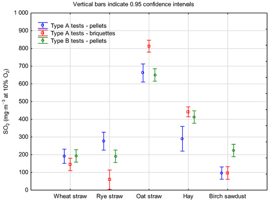 Significant differences in SO2 emissions were also observed during the tests. However, modernization did not lead to an increase in emissions of this compound. The trends in this case were ambiguous. At the same time, 2–3 times higher SO2 emissions were observed during the combustion of biofuels made of oat straw and hay. Minimum values from almost 100 to 200 mg·m−3 at 10% O2 were observed for biofuels from wheat straw, rye straw and wood sawdust—Figure 7.