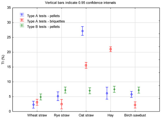 The statistical analysis showed significant differences between the average values of all the analyzed exhaust gas parameters, except combustion efficiency in terms of the plant material grouping factor (p = 0.062). However, post-hoc Tukey tests indicated statistically significant differences in the average CO emission during the combustion of pellets and oat straw briquettes and hay briquettes on the grate in the analyzed three forms of combustion (type A tests—pellets, type A tests—briquettes and type B tests—pellets). For NO emissions, post-hoc tests in the two adopted combustion systems (type A and B tests) did not reveal homogeneous groups in terms of pellet combustion. And in terms of SO2 emissions, these tests showed the lack of homogeneous groups between the SO2 content in the exhaust gases generated when burning pellets and briquettes on the grate and pellets in the gutter burner.