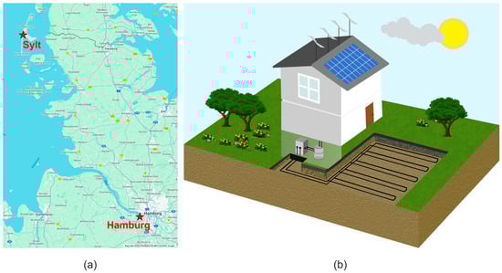 (a) Locations of two detached houses in Hamburg and Sylt (source: Google Maps); (b) Sketch of a detached house equipped with solar panels, on-roof wind turbines and ground source heat pump (horizontal thermal collectors are shown as an exemplary form of heat exchanger).