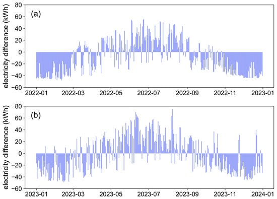 Figure 5 illustrates the electricity difference calculated according to Equations (1), (2) and (8). Overall, the seasons when electricity needs to be purchased from the grid are mainly spread over the winter months, roughly from November to February. During the summer months (May to September), due to the abundant sunshine in northern Germany, a lot of excess electricity is generated that can be sold back to the grid. Because of the seasonal fluctuations in solar and wind energy, solar panels and wind turbines do not produce enough electricity to fully satisfy heat and circulation pumps, as well as household appliances. As electricity is cheaper for the heat pump, the electricity needs of heat pumps are prioritized to be fulfilled. Calculations show that for the three different heat exchangers, the house in Hamburg would need to purchase 3332.7 kWh, 3693.1 kWh, and 3503.9 kWh of electricity per year from the grid for the heat pump, and the house in Sylt would need to purchase 2274.2 kWh, 2578.7 kWh, and 2417.3 kWh of electricity per year for the heat pump. The circulation pump and household appliances also need to purchase a certain amount of electricity from the grid at normal electricity prices to meet their use during the low electricity production period. Figure 5a,b show the total amount of electricity that needs to be purchased and can be fed back to the grid each day for the Hamburg and Sylt houses. A comparison between these data in Table 4 as well as Figure 5a,b indicates that the house in Sylt needs to buy less electricity per year from the grid than in Hamburg since the local wind speed in Sylt is greater than in Hamburg. Correspondingly, it is able to deliver more electricity to the grid and thus receives some more compensation in the form of rebates. In this exemplary renewable energy system, the Sylt house spends less on electricity than the Hamburg house.