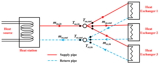 Figure 3 shows the schematic diagram of the topology structure of the secondary hot water supply pipeline, as well as the temperature and its changes with different pipes at the inlet and outlet of the supply and return pipelines at the convergence node. Several different mass flows of hot water are injected into the same node, and then mixed. Tsu,in is the hot water’s inlet temperature in the supply pipeline before injecting the node; Tsu,out is the hot water’s outlet temperature in the return pipeline after mixing at the node; msu,in and msu,out are the inlet mass flow and outlet mass flows of the supply pipe networks, respectively; and mre,in and mre,out are the inlet mass flow and outlet mass flows of the return pipe networks, respectively.