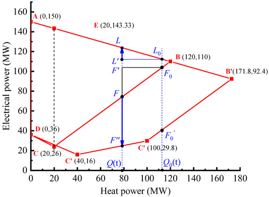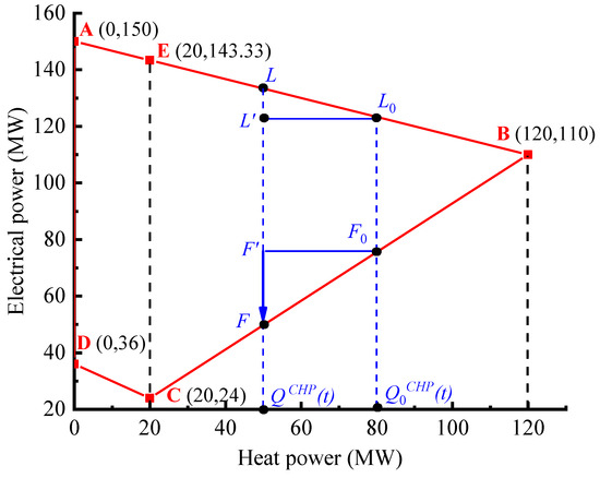 For CHP, the generated electricity is injected into the electricity networks, while the generated heat supplies the heat users through the primary and secondary pipe networks. There are four corner points in the feasible operation region. The heating power output (HPO) and EPO of the extreme point i are defined as and . The generated electrical power and heat power are coupled at any time; any co-ordinate point responding energy generated within the polyhedral operation region can be described by a convex combination of four extreme points. A detailed example of the electricity–heating coupling characteristics is shown in Figure 2 [30].