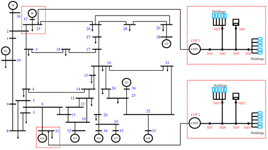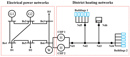 The heat transfer medium and buildings have a large heat capacity, which can flexibly store heat and reduce heat loss. Since the heat capacity of DHNs can be used to replace TS effectively, power supply flexibility can be realized [21,22]. For example, by using the thermal inertia of the heat capacity of buildings, an optimal and flexible dispatch method can be obtained [23,24,25,26,27]. By utilizing the thermal inertia of residential buildings, the economic performance is improved [28,29] and flexible electric power regulation is obtained [30]. The flexibility performance can be further improved by using the thermal inertia of DHNs [31,32,33,34]. In summary, using the thermal inertia of DHNs can promote the consumption of the REE. However, when the heat storage capacity of the DHN is relatively small compared to the power load of the grid, the use of the DHN’s thermal inertia to improve the flexibility or adaptability of REE is not significant. Introducing electricity–heat energy conversion equipment can further improve the flexibility of the power grid in order to achieve the consumption of REE.
