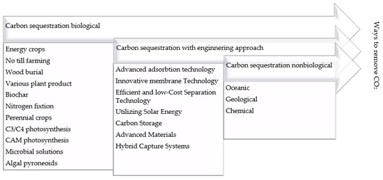 The phenomenon of population growth, particularly in Africa and Asia, the industrialization and globalization that have occurred over the past 150 years, and the resulting significantly increased demand for energy have caused carbon dioxide emissions into the atmosphere to increase to a large extent [29]. Although carbon dioxide is a major component of photosynthesis, its increased emissions have a negative impact on accelerating climate change due to the release of greenhouse gases into the atmosphere. In fact, CO2 accounts for as much as 68% of their total emissions [30]. Moreover, the increase in CO2 release from the latter part of the 20th century and into the 21st century was as much as 50% [31]. Consequently, it is imperative to pursue the development of alternative energy sources that diminish reliance on fossil fuels and CO2 emissions. Additionally, it is crucial to devise technologies that reduce the concentration of CO2 in the atmosphere, including methods such as sequestration and conversion into forms that do not exacerbate global warming. The number of strategies, also referred to as methods, is vast (Figure 1). A classification that is both simultaneous and consistent is a challenging process due to the complexity of the subject matter. For the purposes of this article, the authors have identified three main categories: engineered sequestration, biological sequestration, and non-biological sequestration [32,33].
