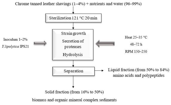 Łukasiewicz Research Network—Lodz Institute of Technology has developed an alternative method for treating tannery waste [127,128] that does not require the use of pure enzymes and chemical reagents. Consequently, the conditions were selected that had the greatest impact on proteolytic activity while having the least impact on yeast cells of the genus Yarrowia. This has enabled the following improvements: shorter substrate processing times; water savings; the resignation of chemicals typically used in chemical–enzymatic hydrolysis; reduced power costs; and reduced costs of culture substrates. This may result in a reduction in carbon dioxide emissions during the production of biostimulants. In the developed method, targeted expression of alkaline proteases is employed in a one-step process at the culture stage, as depicted in Figure 3.
