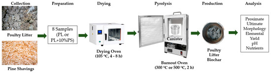 PL samples were collected from a permanently roofed storage shed at two local poultry farms, Bethel Farm (4013 St Lukes Rd, Salisbury, MD, USA) and Sun Farm (14470 Backbone Rd, Eden, MD, USA). Samples were transported to the testing site and stored in plastic bags at a room temperature of 23 °C before the pyrolysis testing. Pine shavings used for animal bedding material were obtained from a local store. The PL used was broiler litter, which was a mixture of poultry manure, spilled feed, feathers, dead bird remains, and bedding material (sawdust for these two poultry houses). The percentage of bedding material depends on the initial depth (a layer of bedding material that was added when a new poultry house was built, reusing the material for many years) as well as the replacement amount (about 25.4–50.8 mm over the top level) during the cleaning period. Collected PL samples contained little bedding material because these two houses were built more than 15 years ago. In this study, 10% wt. of pine shavings was added as bedding material to collected raw PL samples to simulate more realistic conditions and allow one to better investigate the effect of bedding material on quality of the PLB [23].